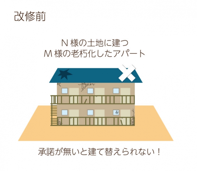 今から30年も前の話。 今もわたしたちとお付き合いさせていただいているK様は、先代から借地を相続されたものの、そこに建っていたのは老朽化して費用ばかりかかって収益のあがらないアパートでした。 借地上の建物は建て替えるにも貸主の承諾が必要となり、承諾料(一般的に更地価格の2~3%)がかかってしまいます。K様はこの借地の問題を解決するためにご相談にお見えになりました。